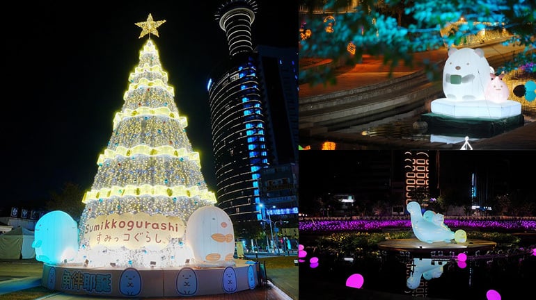 柳川水舞台設置角落小夥伴五位角色與蜥蜴母親的大型立體氣偶「蜥望舞伴」,搭配水舞與燈光秀營造夢幻河畔夜景。造型燈飾融入台中特色,包括企鵝泡溫泉的「來企泡湯」、白熊品茶的「白熊好品」,以及炸豬排與炸蝦尾在民權路「炸物食堂」展出。綠川則打造「幸福快遞」與「耶誕之森」,並以莓粉與雪花藍呈現「雪花光廊」。