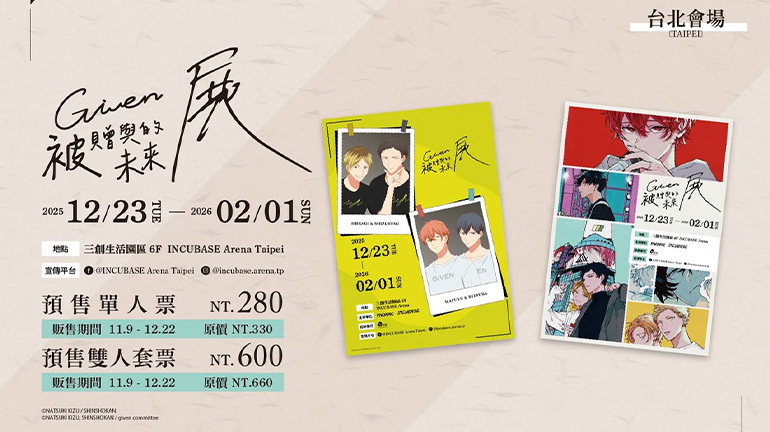 全球超人氣 BL 作品《GIVEN 被贈與的未來》首度來台展出!2025/12/23 - 2026/2/1 於台北三創生活園區 6 樓登場。這部觸動人心的作品,不僅描繪戀愛的悸動,更真實刻劃角色們在傷痛中尋找出口的情感旅程。展覽完整呈現從漫畫、動畫到音樂的感動元素,讓粉絲近距離感受創作的溫度與細膩。