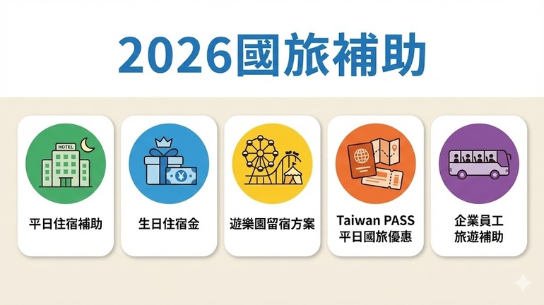 2026台灣國旅補助來嘍!提供五大方案,包含平日住宿補助、生日住宿金、遊樂園憑住宿證明免費入園、Taiwan PASS平日國旅優惠、企業國旅獎勵方案,一起來看看這些補助要如何申請、又分別在哪時候實施吧。| 方案名稱 | 適用日期 | 補助內容概述 | |